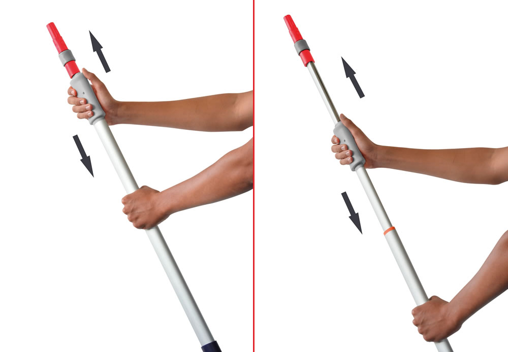 Pertica leggera in alluminio con forma ergonomica, allungabile da 106 a 219 cm con un solo pratico movimento.